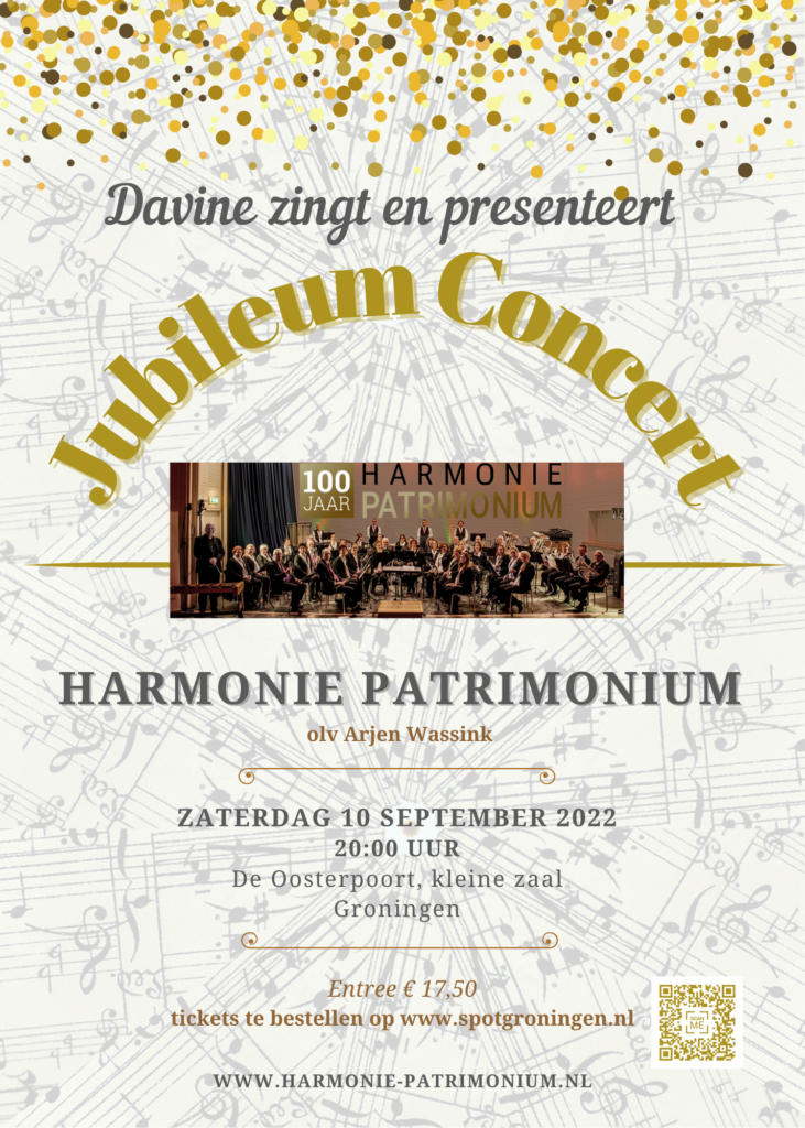 Op 10 September 2022 geeft Harmonie Patrimonium een spetterend jubileum-optreden! De presentatie wordt gedaan door Davine en voor ons prachtige orkest staat Arjen Wassink. Dit is een optreden dat je niet wilt missen!!