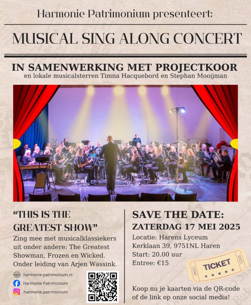 Een avond genieten van prachtige musical muziek waar je zelfs mag meezingen! Harmonie Patrimonium organiseert voor u een musical Sing-A-Long. In samenwerking met een speciaal opgesteld project koor met solisten.